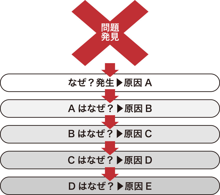 問題の原因追求は“なぜ?”を5段階ぐらい深めて探求すると、多面的な原因A〜Eから真因が掴め、問題解決に役立つし、何よりも知恵が湧く思考力を育むよ。