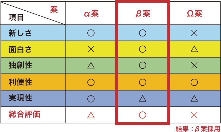 考案した複数の解決策から目標を達成出来る最適な案を選ぶ場合、客観評価が有効な手段です。参考に事例を紹介します。