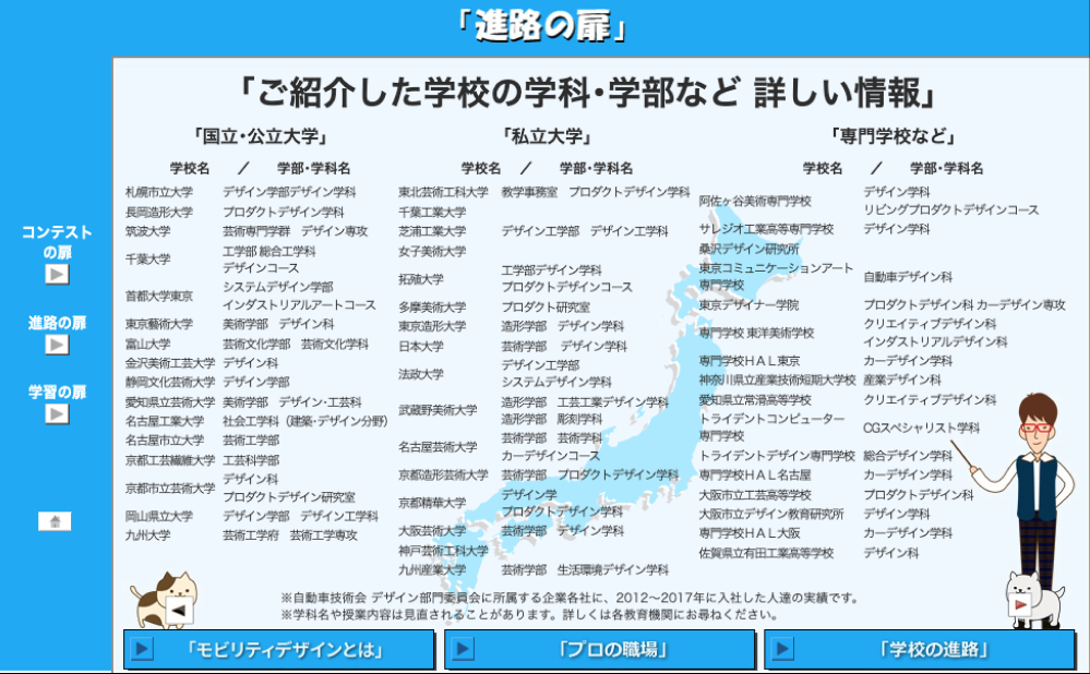将来の志望別に事務系、工学系、芸術系、専門技術系など創造性の学び方も多様です。学ぶ場も国内や海外もあり、進路は色々です。 ここでは調べにくいクリエイター&デザイン系の教育機関をJSAE/自動車技術会デザイン部門委員会のご協力で紹介します。